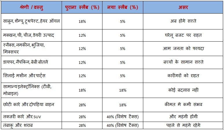 नोट: ऊपर दी गई सभी जानकारियाँ 3–4 सितंबर 2025 की आधिकारिक ब्रीफिंग/मीडिया रिपोर्ट्स पर आधारित हैं, और प्रभाव-तिथि 22 सितंबर 2025 है। अंतिम HSN-वार सूची/नोटिफ़िकेशन जारी होते ही व्यापारी अपनी श्रेणियों का मिलान करें।